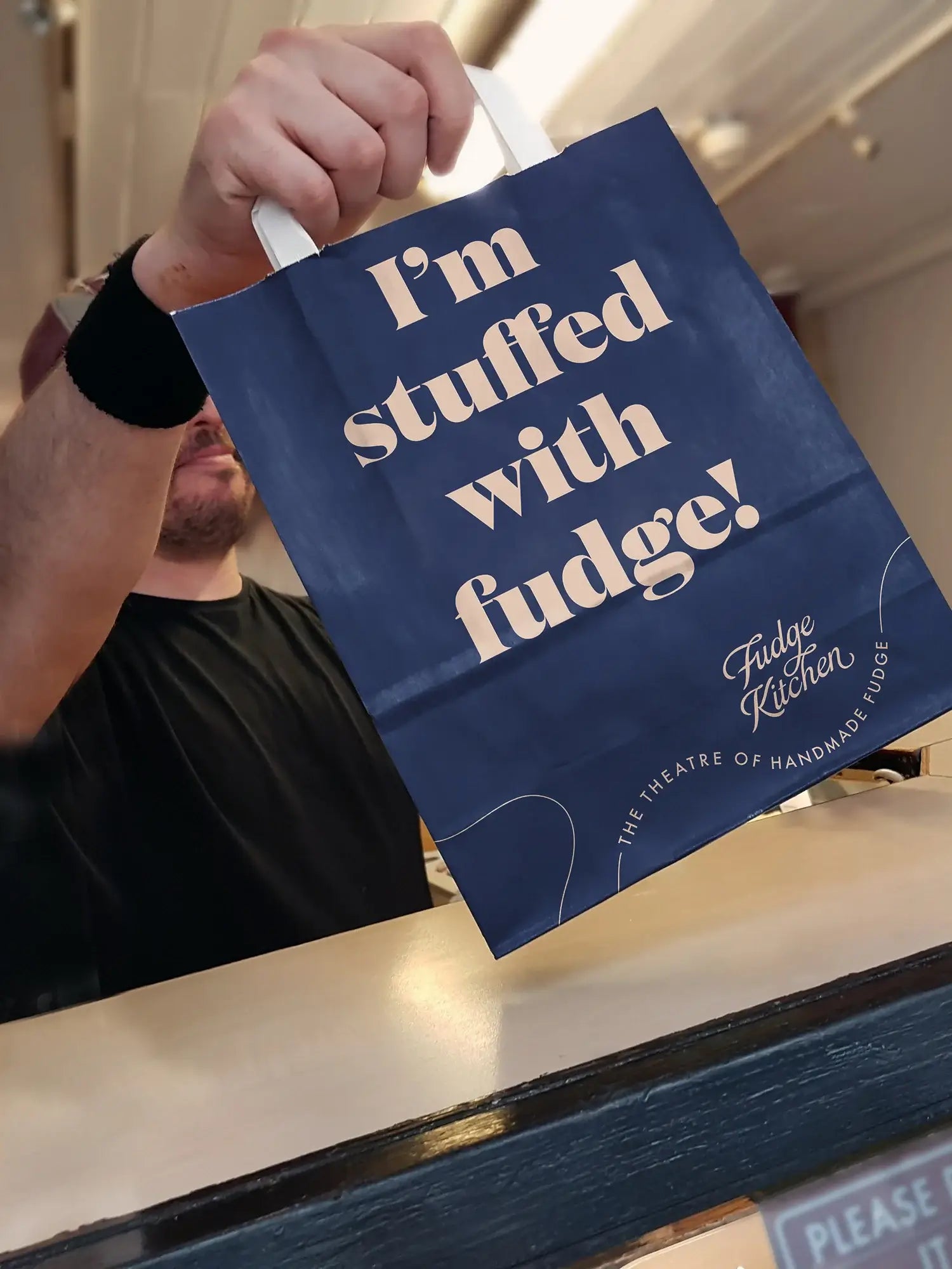 Close up of a staff member holding a fudge bag with the words "I'm stuffed with Fudge!"