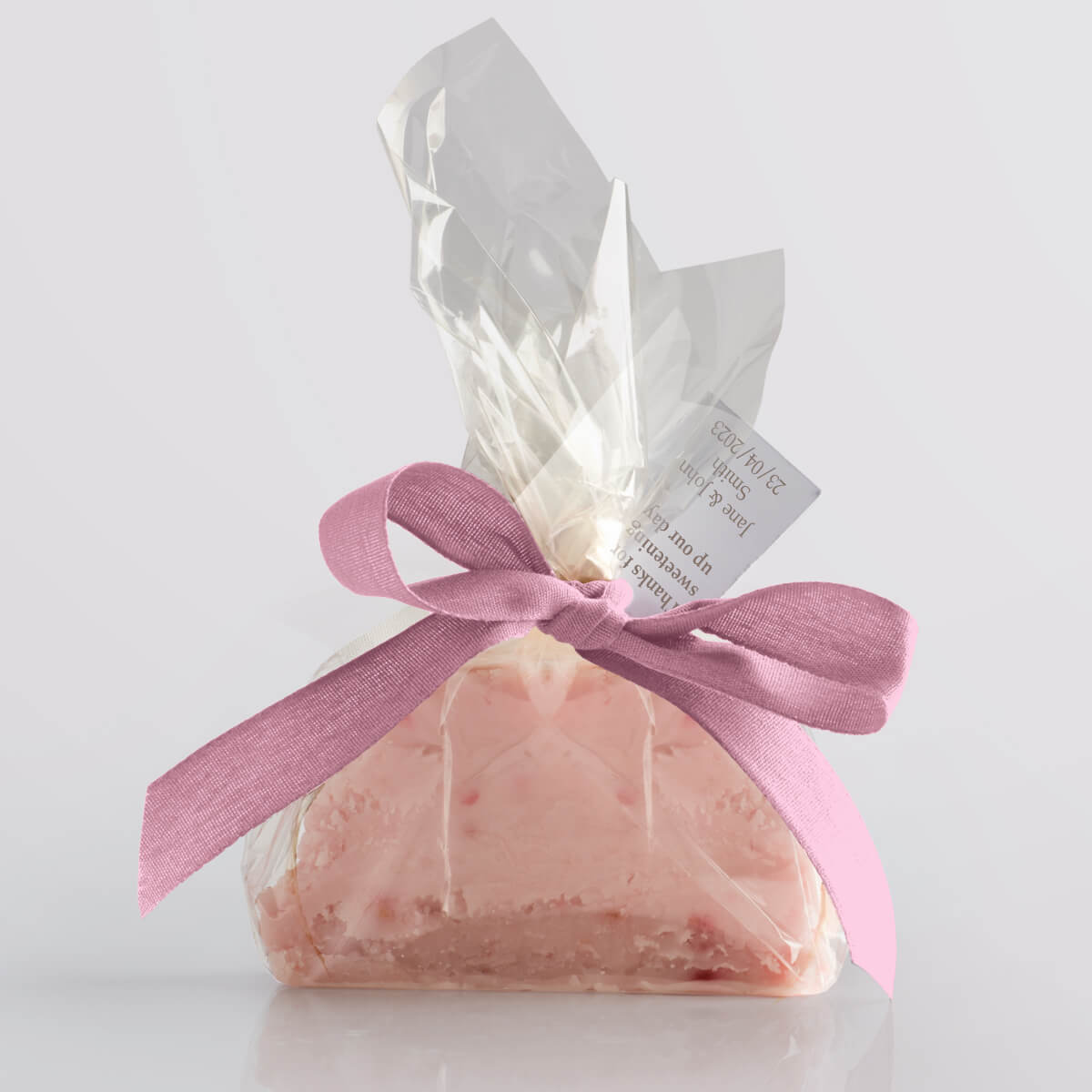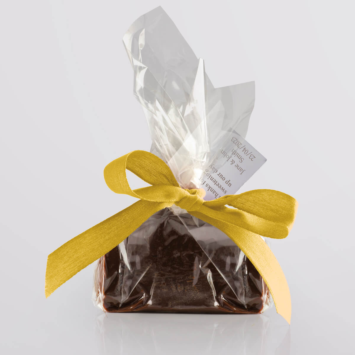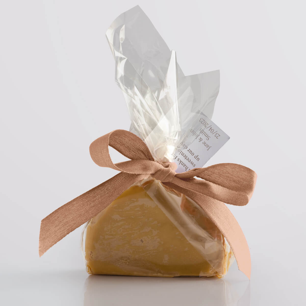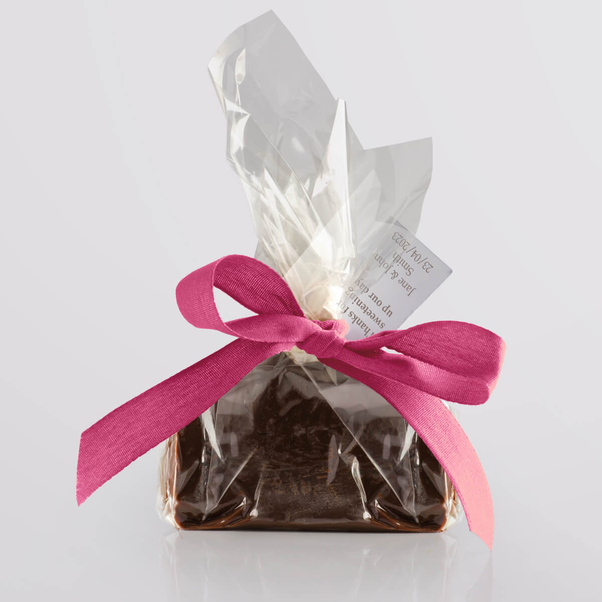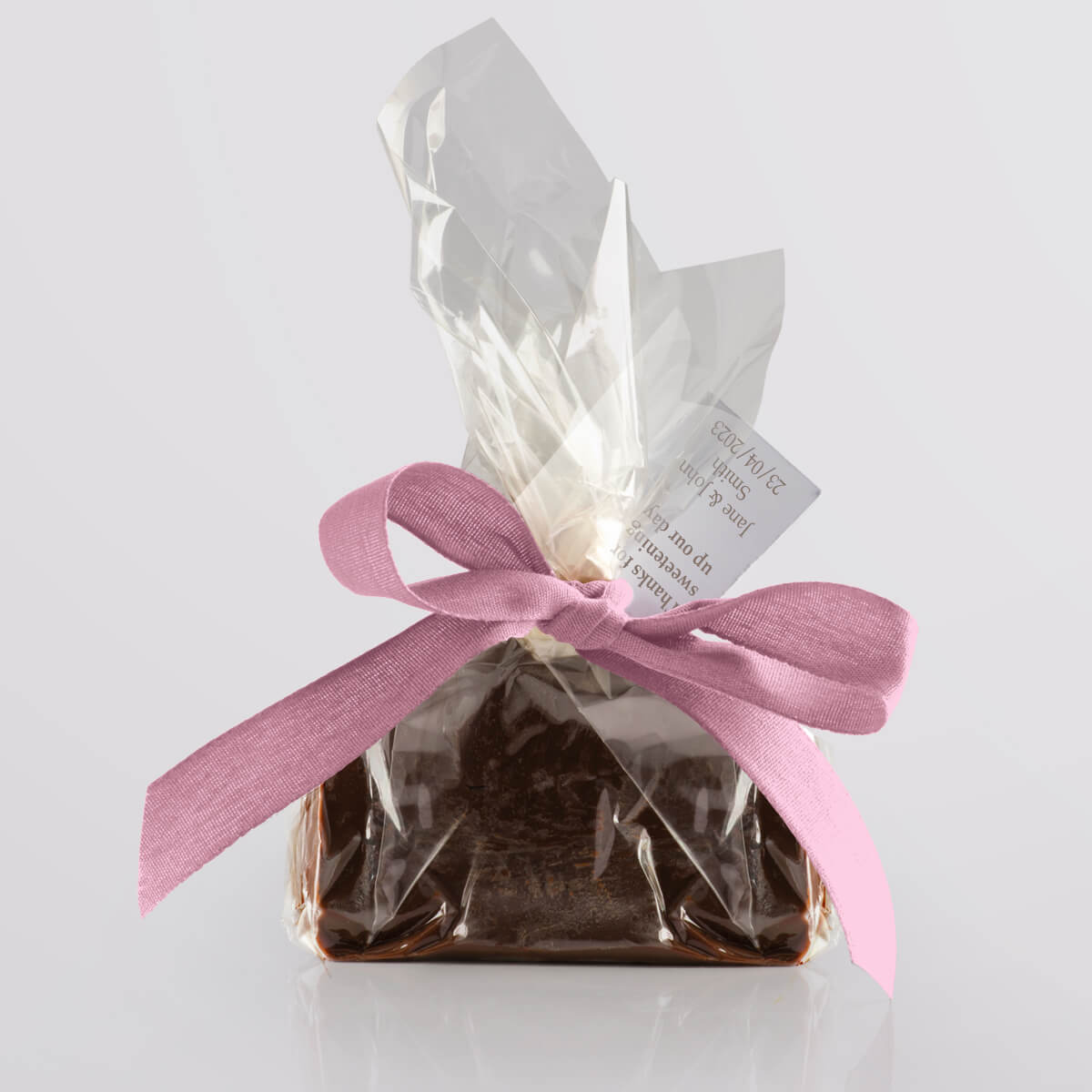 We hand-produce your chosen flavour of delicious vegan fudge in single mini slices and wrap them in a compostable & biodegradable clear film. We then seal the fudge twist with a paper twist and decorate it with a biodegradable ribbon, available in a wide range of vibrant colours. Tags add that finishing touch, allowing you to give your guests a welcoming message or use the favours as place settings.
