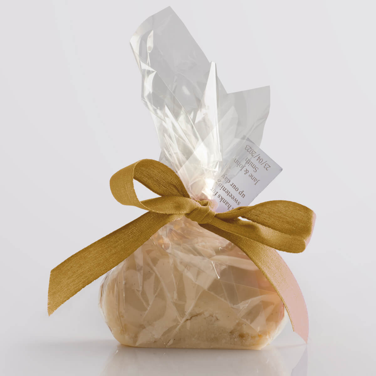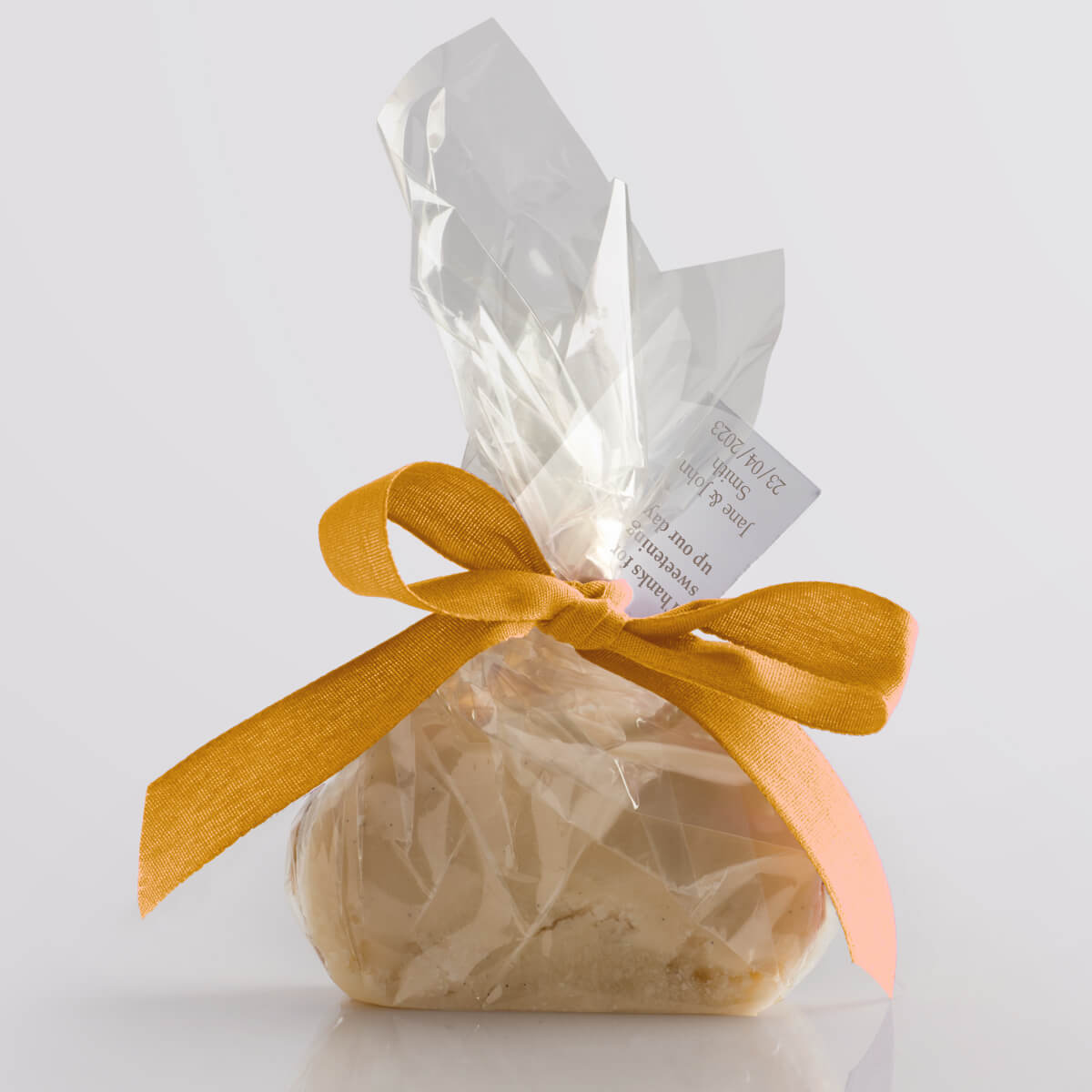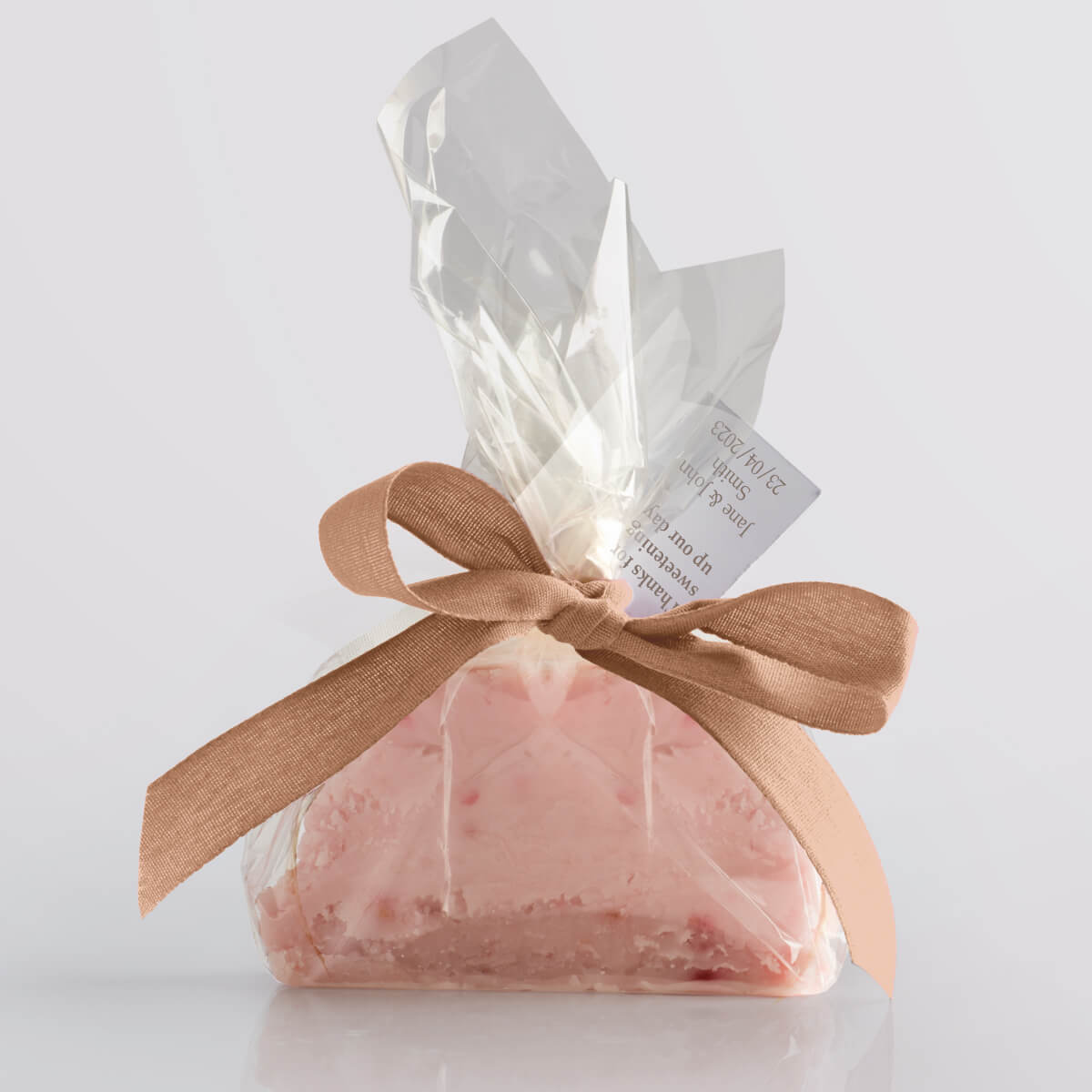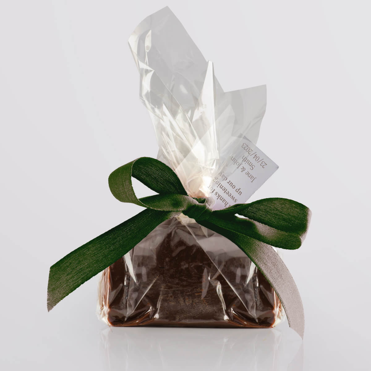 We hand-produce your chosen flavour of delicious vegan fudge in single mini slices and wrap them in a compostable & biodegradable clear film. We then seal the fudge twist with a paper twist and decorate it with a biodegradable ribbon, available in a wide range of vibrant colours. Tags add that finishing touch, allowing you to give your guests a welcoming message or use the favours as place settings.