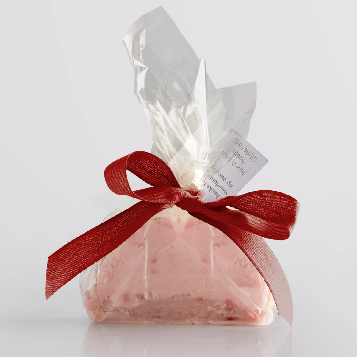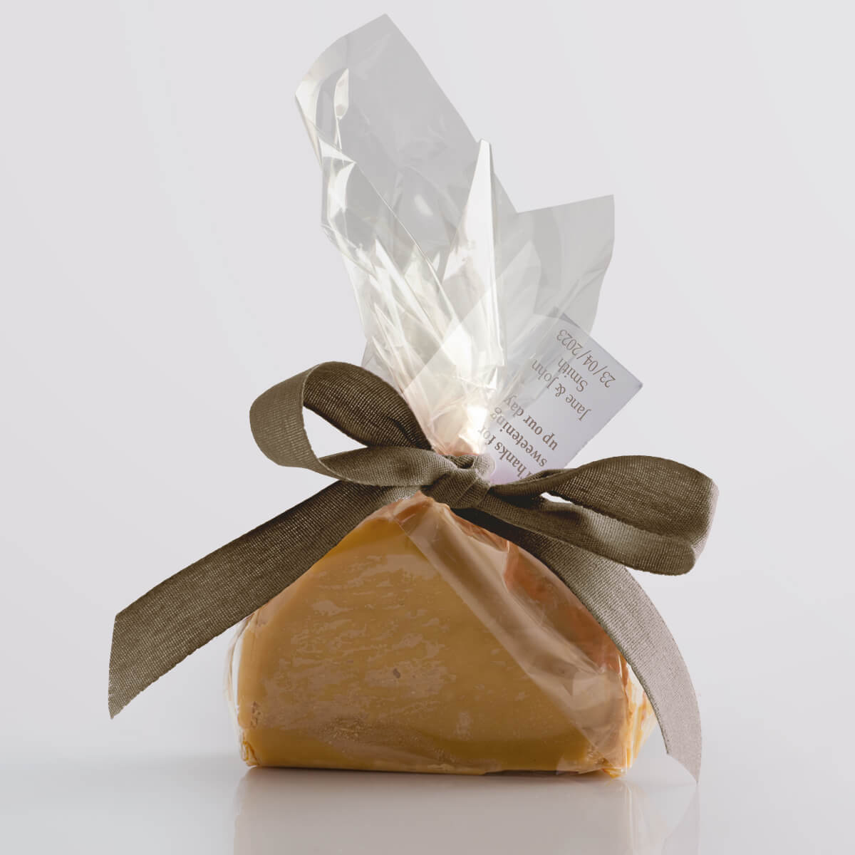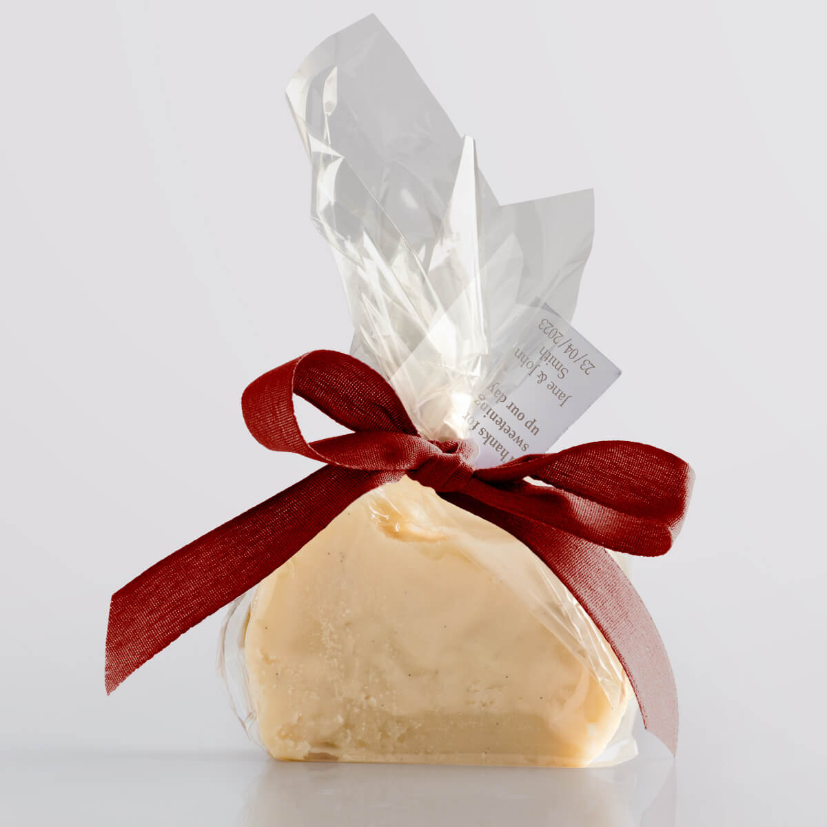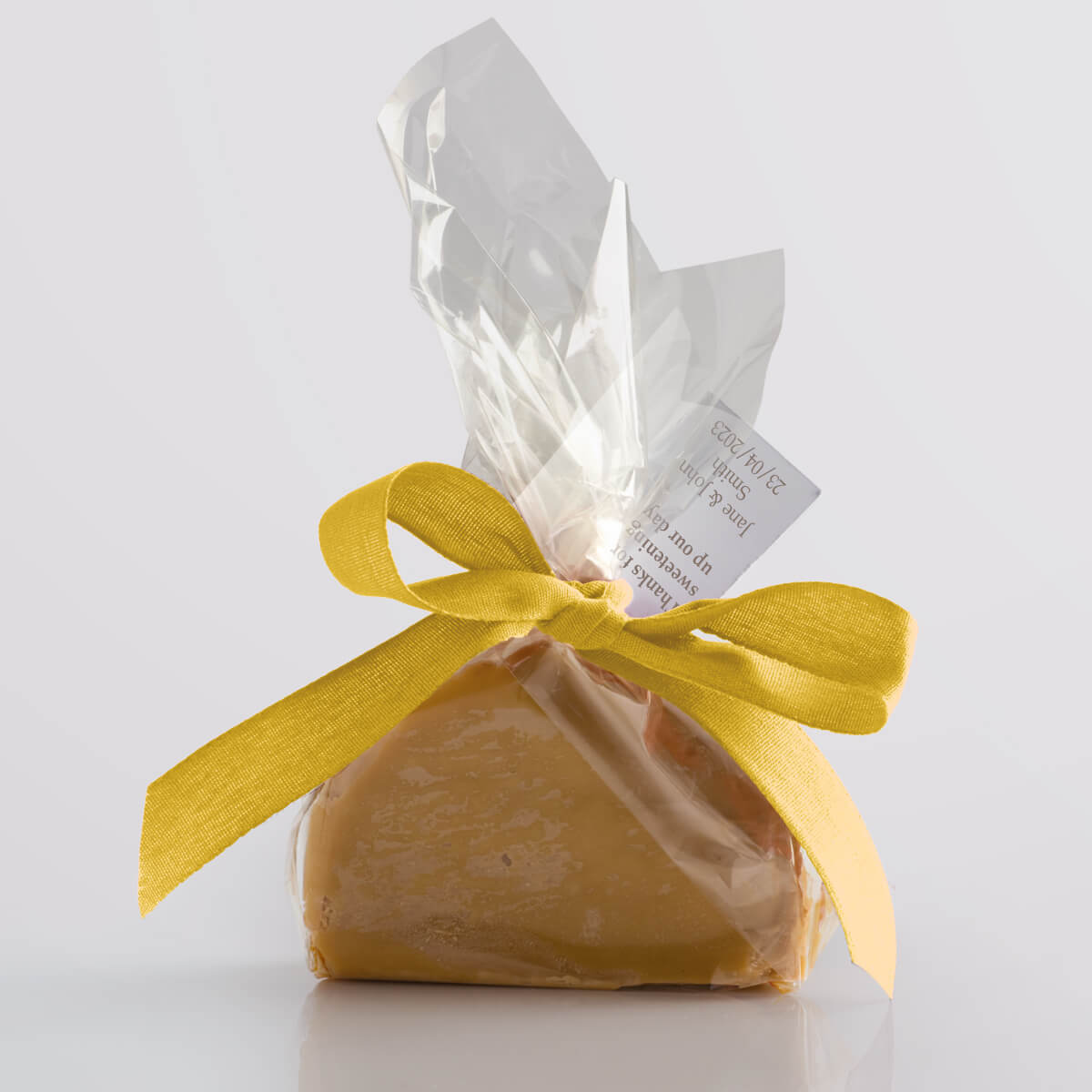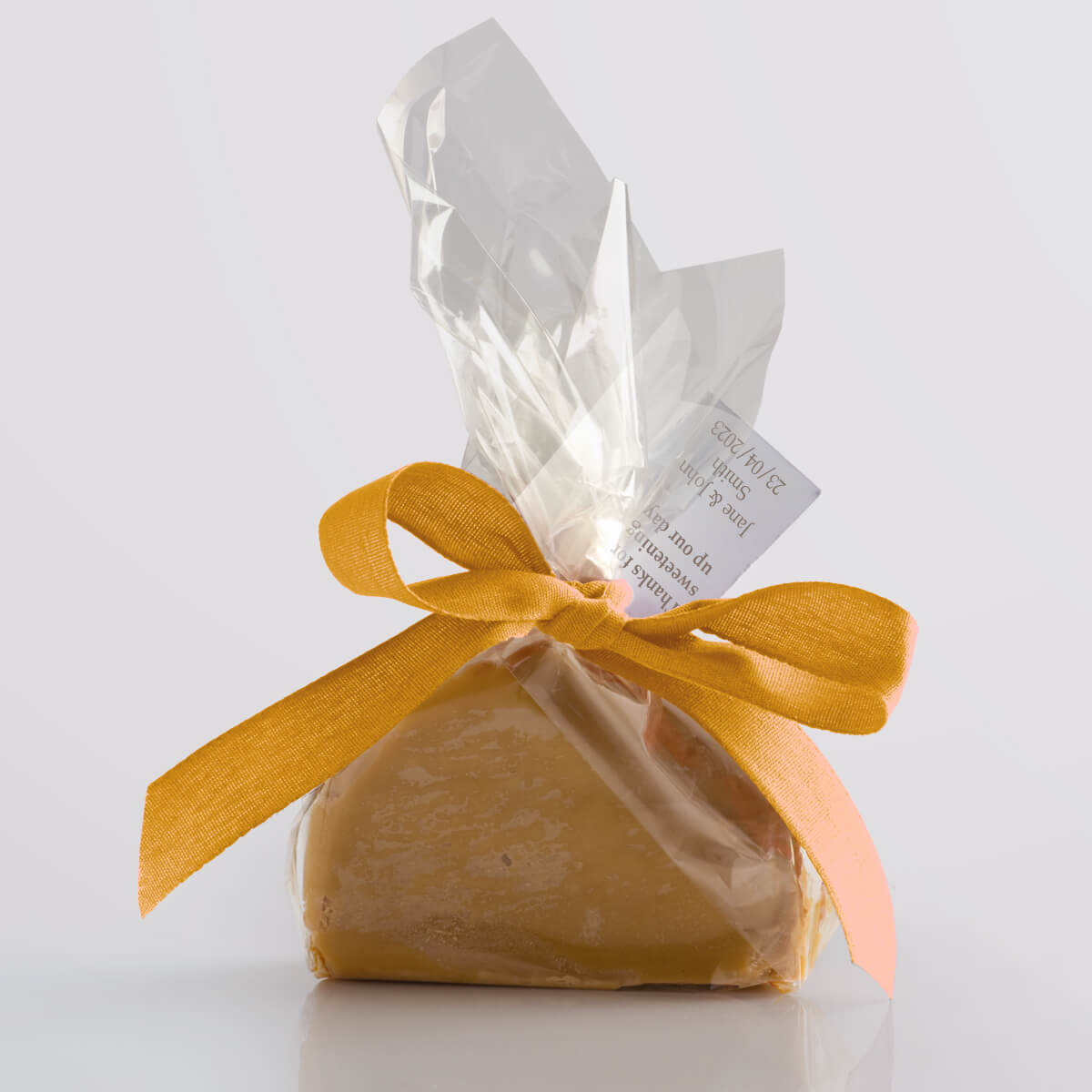 We hand-produce your chosen flavour of delicious vegan fudge in single mini slices and wrap them in a compostable & biodegradable clear film. We then seal the fudge twist with a paper twist and decorate it with a biodegradable ribbon, available in a wide range of vibrant colours. Tags add that finishing touch, allowing you to give your guests a welcoming message or use the favours as place settings.
